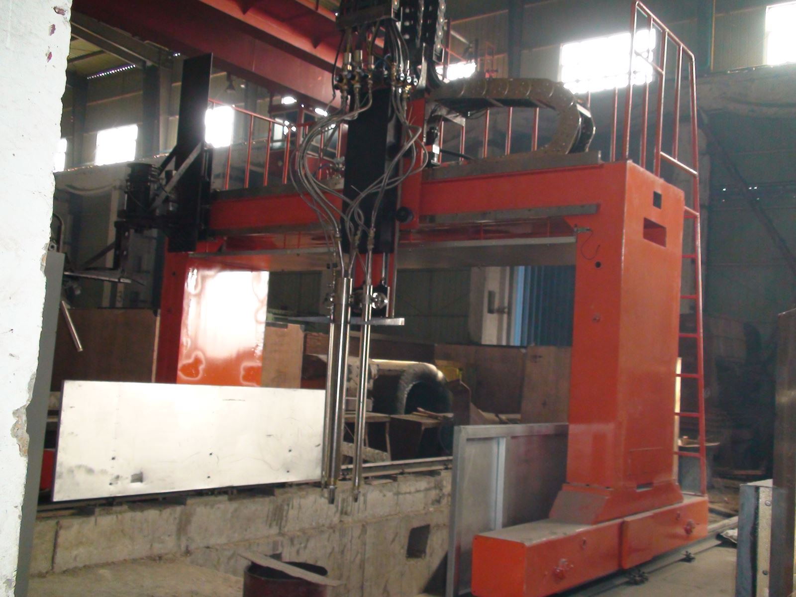 ● 龍門所配二臺焊機、保護氣氣瓶(至少2個)、控制柜等均放在龍門兩側托架上,隨龍門一起移動,進龍門的外部供電線纜采用滑線供給,使得龍門移動范圍加大。