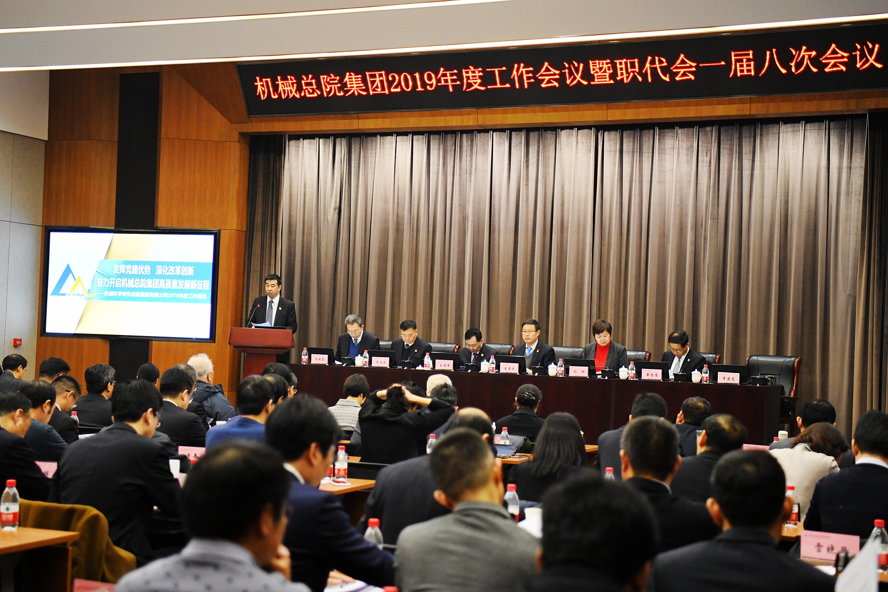 王德成董事長、黨委書記、總經(jīng)理代表集團(tuán)領(lǐng)導(dǎo)班子在年度工作會議上作了《發(fā)揮黨建優(yōu)勢 深化改革創(chuàng)新 奮力開啟機(jī)械總院集團(tuán)高質(zhì)量發(fā)展新征程》的工作報告,報告全面回顧了機(jī)械總院集團(tuán)2018年度工作,傳達(dá)了國資委對中央企業(yè)和地方國資委的工作要求,客觀分析了集團(tuán)當(dāng)前面臨的形勢和任務(wù),詳細(xì)部署了集團(tuán)2019年度工作。王德成董事長指出:2018年,機(jī)械總院集團(tuán)全面深入學(xué)習(xí)貫徹習(xí)近平新時代中國特色社會主義思想、黨的十九大精神和中央經(jīng)濟(jì)工作會議精神,堅持和加強(qiáng)黨的全面領(lǐng)導(dǎo),堅持穩(wěn)中求進(jìn)工作總基調(diào),堅持新發(fā)展理念,按照高質(zhì)量發(fā)展的要求,以深化供給側(cè)結(jié)構(gòu)性改革為主線,全力推動戰(zhàn)略引領(lǐng)、深化改革、加速創(chuàng)新、提升管理和加強(qiáng)黨建,強(qiáng)化擔(dān)當(dāng)、狠抓落實(shí),各項工作取得了顯著成績。2019年,機(jī)械總院將以習(xí)近平新時代中國特色社會主義思想為指導(dǎo),全面貫徹黨的十九大、十九屆二中、三中全會和中央經(jīng)濟(jì)工作會議精神,堅持和加強(qiáng)黨的領(lǐng)導(dǎo),緊緊抓住機(jī)械總院集團(tuán)發(fā)展重要戰(zhàn)略機(jī)遇期,按照高質(zhì)量發(fā)展要求,發(fā)揮黨建優(yōu)勢,深化戰(zhàn)略引領(lǐng),做強(qiáng)應(yīng)用型科研、持續(xù)提升創(chuàng)新力,做優(yōu)服務(wù)型產(chǎn)業(yè)、加力行業(yè)服務(wù)引領(lǐng)力,保持技術(shù)經(jīng)濟(jì)穩(wěn)定增長,為推動裝備制造業(yè)高質(zhì)量發(fā)展、助力制造強(qiáng)國戰(zhàn)略實(shí)施做出新貢獻(xiàn)。