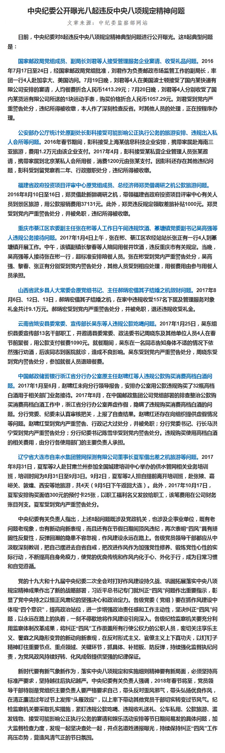 2月8日中央紀委公開曝光八起違反中央八項規定精神問題